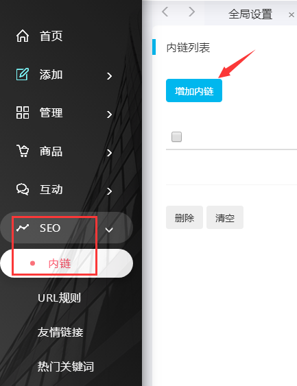 方法是登陸網(wǎng)站后臺 - [ SEO ] - [ 內(nèi)鏈管理 ] - [ 添加內(nèi)鏈 ] 進行添加。