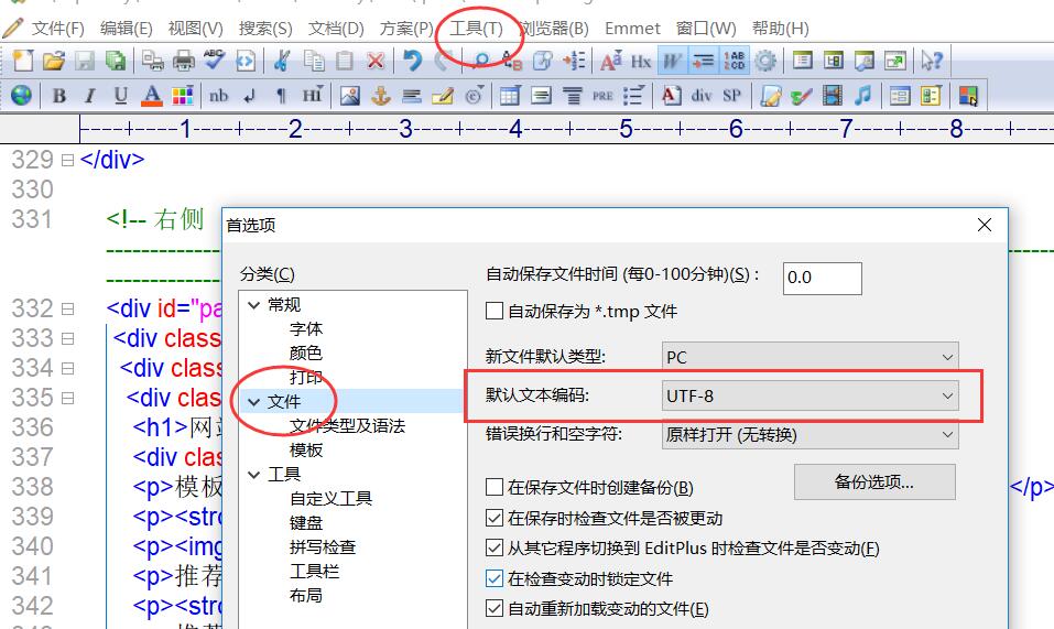 打開編輯器,在[工具]-[文件]-[編碼],里面選擇utf-8,選擇后編輯模板保存的文件默認(rèn)編碼為utf-8。