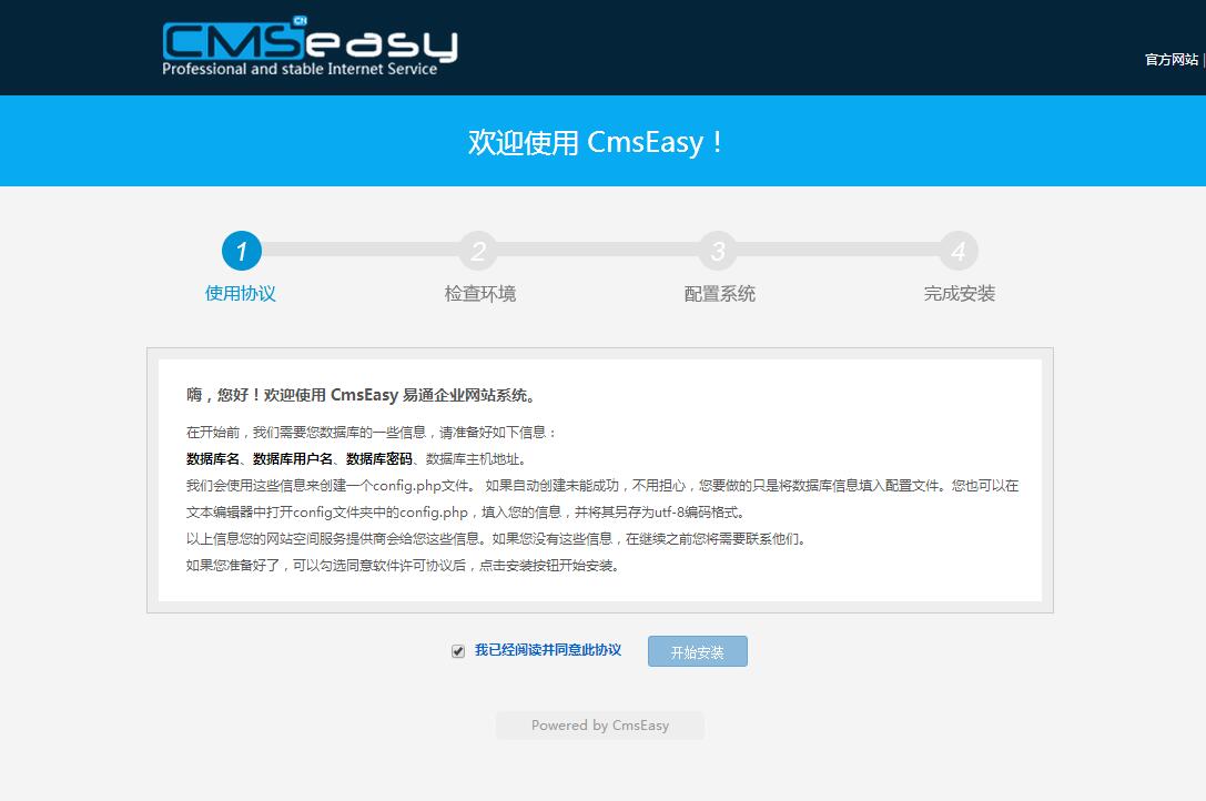 現(xiàn)在我們要做的就是安裝CmsEasy,在網(wǎng)頁地址欄輸入框中,輸入 http://域名/install 后,按回車鍵,即可進入安裝界面,如同: