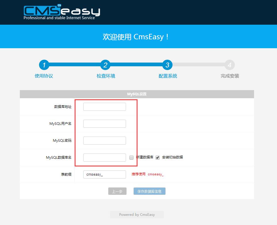 文件權限檢查正確后,下一步為填寫數(shù)據(jù)庫信息頁面,如無數(shù)據(jù)庫信息,可聯(lián)系空間商獲取,或登陸購買的空間后臺查看數(shù)據(jù)庫信息!