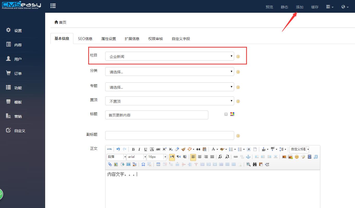 也可直接點(diǎn)擊頭部快捷按鈕 [ 添加 ] 打開添加內(nèi)容窗口,欄目下拉選擇,請(qǐng)務(wù)必選擇與標(biāo)簽調(diào)用一致的欄目。