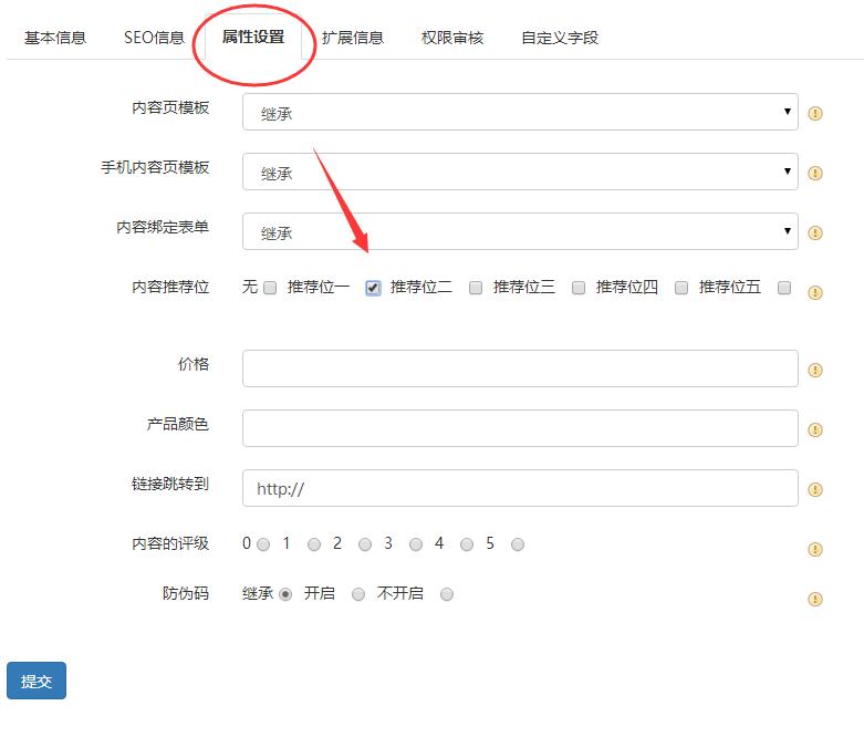 在編輯內(nèi)容頁面中,[ 屬性設(shè)置 ] - [ 推薦位 ] 中,勾選標(biāo)簽設(shè)定的推薦位,如: