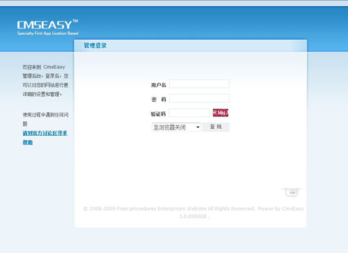 1、在瀏覽器地址欄中輸入如 http://域名/admin后回車,將出現(xiàn)CmsEasy登錄界面 (注意:當使用偽靜態(tài)后,登錄地址請用http://域名/?admin_dir=admin) |