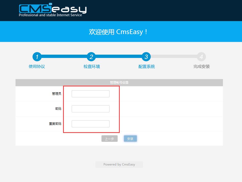 數(shù)據(jù)庫信息填寫正確后,點擊 保存數(shù)據(jù)庫信息后,跳轉到設置管理員用戶名和密碼界面,如圖: