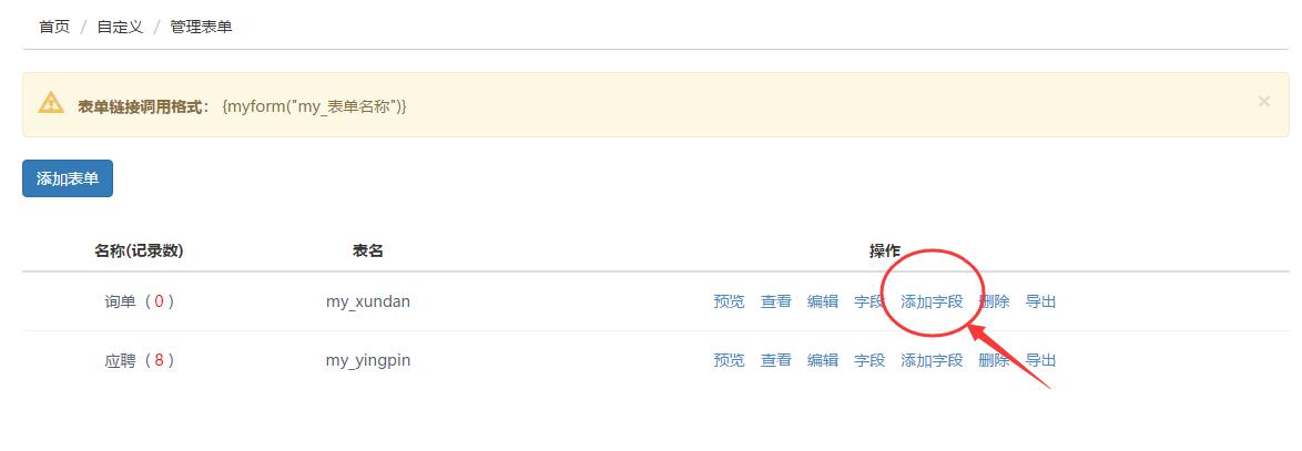 提交后,生成一個新表單,但表單內(nèi)容為空,如何向表單添加字段可參考如圖: