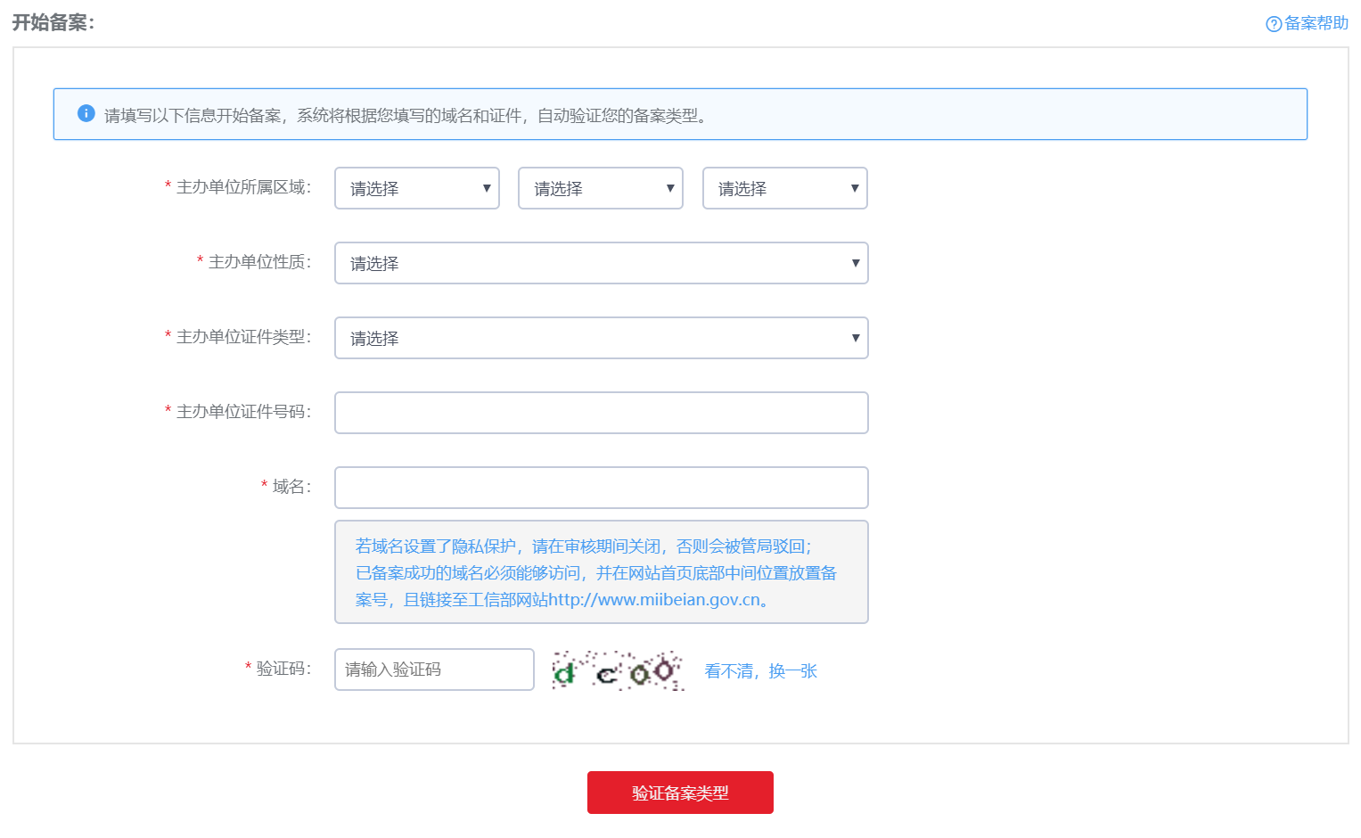 2、按提示填寫(xiě)已備案同一個(gè)主體的主體和域名信息信息,然后單擊 驗(yàn)證備案類(lèi)型。
